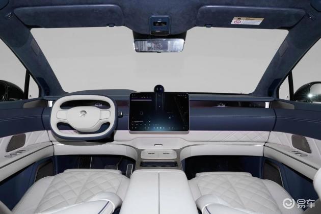 内饰部分,蔚来ET9采用的是环抱式的布局方式,并运用了左右对称式的处理,潜沙白+暗蓝色的双拼内饰配色显得十分高级,车厢内采用了大量的皮质进行包覆,车顶的材质为翻毛皮,搭配主动式256色环境氛围灯,使其豪华氛围感营造得较为出色,上下平底样式的两幅式多功能方向盘造型时尚个性,采用的是真皮的材质,支持上下前后四向电动调节,并带有记忆和加热功能,换挡形式为电子式怀挡,并在前排中央扶手处配备了手机无线充电功能以及2个USB/Type-C的多媒体接口。在中控台的前端左右两侧各配备了比较窄的屏幕,替代了传统的仪表盘,可查看行车信息较为丰富,并且还配备了抬头显示系统(HUD),可以将常用的行车信息投射到前挡风玻璃上,方便驾驶员读取,而中控台则搭载的是一块带有SkyOS·天枢车载智能系统的15.6英寸3K液晶大屏,内置了高通骁龙8295P车载智能芯片,智能化表现非常丰富,支持手机App远程控制、高德地图导航、蓝牙/车载电话、车联网、OTA升级、面部识别、语音识别控制系统、Wi-Fi热点以及应用商店拓展等功能。