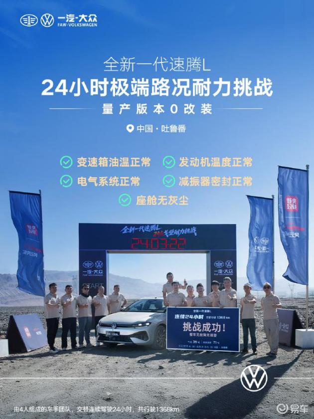 与新能源车聚焦“高速性能”不同,燃油车的 24 小时极端挑战更侧重于机械结构在恶劣环境下的耐久性,非铺装路面与极端高温成为主要测试场景。2025 年 9 月,一汽-大众速腾 L 在新疆吐鲁番国家高温干热试验场的测试,堪称燃油车机械可靠性的典型案例。此次测试中,地表温度高达 71℃,非改装量产版速腾 L 需连续 24 小时在非铺装砂石路上行驶——这种路面不仅对悬挂系统、轮胎耐磨性提出高要求,更会通过震动传导对发动机、变速箱的密封性能与电气系统稳定性形成考验。最终,车辆累计行驶 1368 公里,车手轮换驾驶期间,发动机与变速箱油温始终保持在正常范围内,电气系统零故障,减震器密封完好且驾驶舱无灰尘侵入,展现出极强的环境适应性。