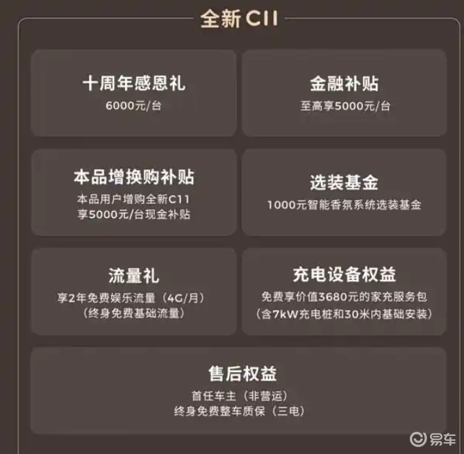 临近年底,零跑12月份购车能够享受6000元的十周年感恩礼现金补贴,进一步降低了购车门槛,本品用户增换购有5000元现金补贴,还有至高5000元金融贴息,实实在在的在帮用户减轻压力;还有其他包含三电的整车终身质保等权益都挺吸引人。