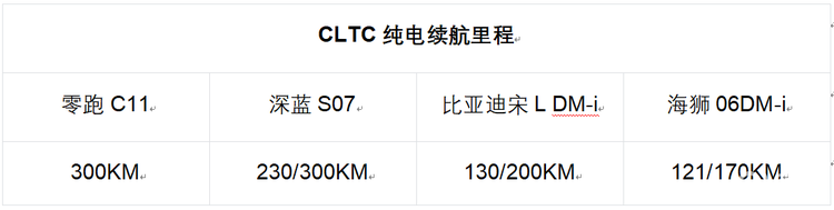 对于选择混动SUV的用户来说,他们同样对“纯电续航”的诉求也相对较高,因为这直接决定了日常的用车成本以及出行便利性。零跑C11增程版售价为14.98-15.98万元,全系的纯电续航里程为300KM,深蓝S07增程版的售价区间为14.99-17.39万元,纯电续航里程是230KM和300KM,比亚迪宋L DM-i售价区间为13.98-15.68万元,纯电续航里程分别是是130KM、200KM,海狮06 DM-i的售价区间为13.98-15.68万元,纯电续航里程分别是121KM、170KM,如果按照每天通勤50KM来计算,只有零跑C11和深蓝S07每周只需要充一次电就可以,所以日常当做纯电车来使用完全没有问题,能够大幅降低油费支出,但是深蓝S07仅顶配版本是300KM的纯电续航。