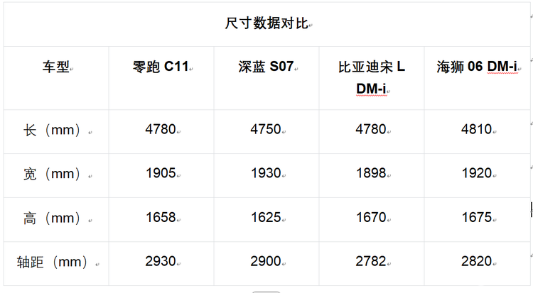 四款车型定位的都是家用SUV,因此空间表现和内饰质感显得尤为重要,零跑C11的长宽高分别为4780*1905*1658mm,轴距为2930mm,比亚迪宋L DM-i的轴距为2900mm,海狮06DM-i的轴距为2770mm,深蓝S07的轴距为2900mm,显然零跑C11的空间更有优势,后排的腿部空间更充裕,保证了车内成员的空间体量感表现。