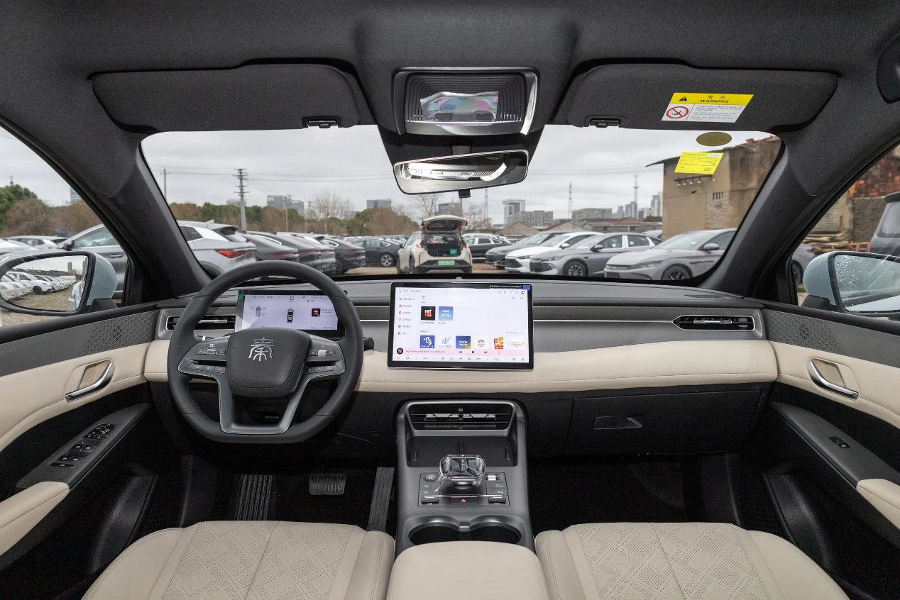 秦PLUS EV被摆在很显眼的位置,不愧是店里的走量车型。一坐进去,传统车企的设计风格扑面而来,密密麻麻的实体按键,精打细算的用料都体现了成本优先的思路,这些我也能理解,毕竟车的指导价只有8.98-17.58万元。空间感受属于同级别主流水平,4795x1837x1515mm的三围配合2718mm轴距,看起来不小算气。不过车内空间并没有很惊艳,我调整好前排坐姿后,后排腿部空间大概两拳半,没有那种“越级”的宽敞感。