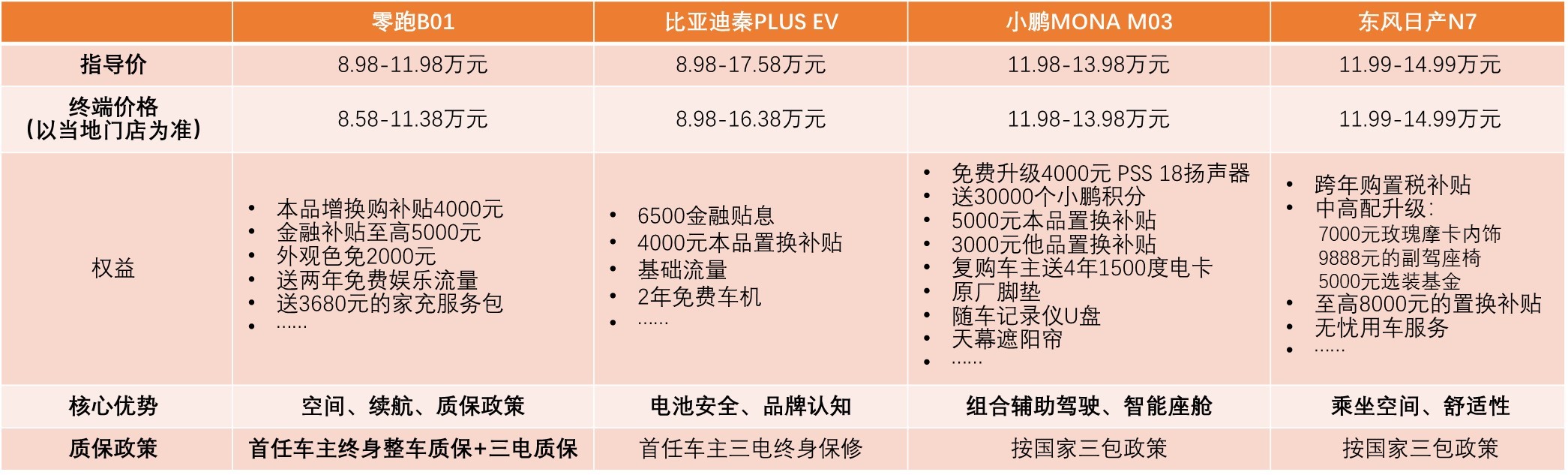 为什么要分析这四款车呢?因为它们确实是目前10万级别热度很高的车型。零跑B01作为新势力龙头产品,凭借越级配置引起了市场热议;比亚迪秦PLUS EV身为自主品牌一哥的产品,拥有深厚的市场基础;小鹏MONA M03是网红产品,以智能化为主打卖点;而东风日产N7则凭借合资品牌的品质和舒适性占据一席之地。