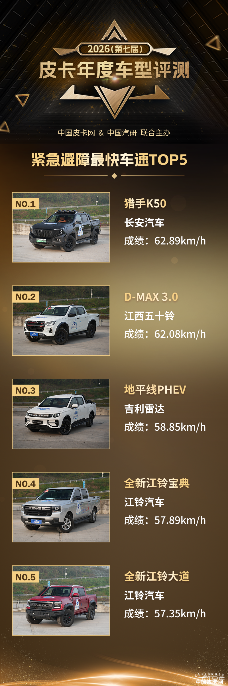 上面公布的成绩中,长安猎手K50通过紧急避障的车速最快,达到了62.89km/h,也就是说明在遇到突发障碍时,这台车有更稳定的车身姿态快速通过,车辆可控性更强。预计是由于这台车的电池部分位于车辆底部,重心较低,并且整车在悬架稳定性控制方面有着非常好的调校,得以有此优秀成绩。另一台新能源皮卡雷达地平线PHEV凭借着承载式车身的优势位列第三。而江西五十铃D-MAX 3.0仍然有较好的调校水准,位列第二。