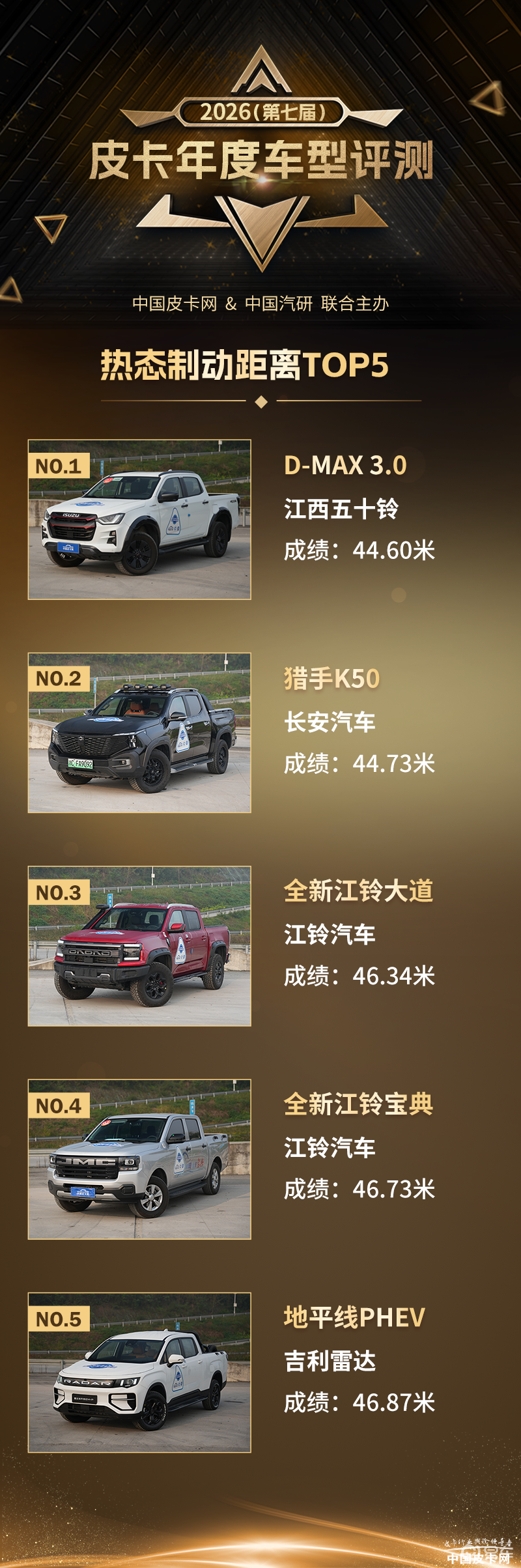 众所周知,前不久我们举行了2026皮卡年度车型评测活动。在这个活动的客观测试部分中,中国汽研的工程师会根据评测规程测试诸多项目,项目执行期间也有很多网友十分关心测试成绩,纷纷留言。今天开始我们就会筛选一些大家比较关注的项目,公布一些取得优秀成绩的车型。作为大家购买皮卡时非常关注的一点,安全性一直是所有车企都非常重视的方面,所以我们最先公布安全相关的测试成绩,这其中就包括了刹车制动以及紧急避障。