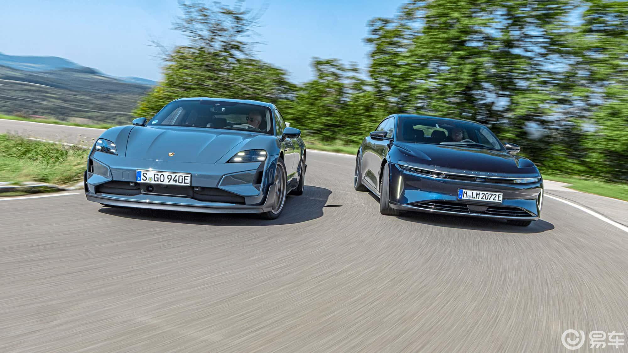 在乡道上,Lucid令人惊讶地拥有很长的悬挂行程。别急着联想到老派美式“摇船”——前双叉臂,后多连杆,加上偏硬的自适应减震。即便是钢制悬挂(Bilstein提供),车身控制依旧出色,不易被起伏路面扰乱。而对于德国工程,在这里早已拉开差距。Taycan拥有当前电动车中最出色的底盘系统之一:空气悬挂、无防倾杆、每个车轮可独立施压或抬升。结果是——即便单侧压过路肩,车身依旧稳如磐石。