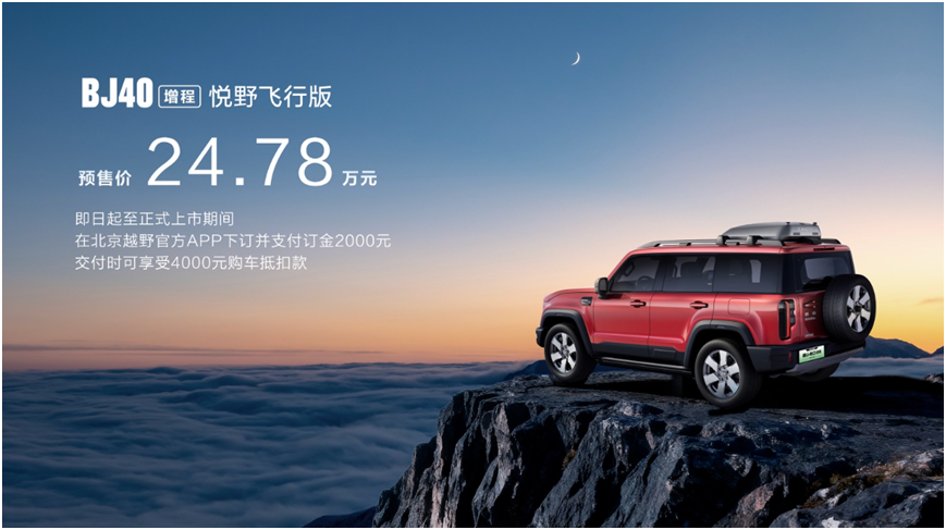 BJ40增程悦野飞行版开启全球预售,预售价24.78万元。1月27日起至正式上市期间,在悦野圈APP下订并支付订金2000元,交付时可享受4000元购车抵扣款。