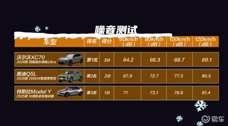通常在极寒天气下,车身被冻“硬”后噪音往往会很明显,所以第7项进行了静谧性测试。此项测试下,沃尔沃全新XC70得益于整车35处声学包设计,可以更直接地抑制噪音和震动,加上它的发动机还带有降噪功能,车内配备的扬声器也可以反向抵消噪音,最终在测试中也拿出了最佳表现。