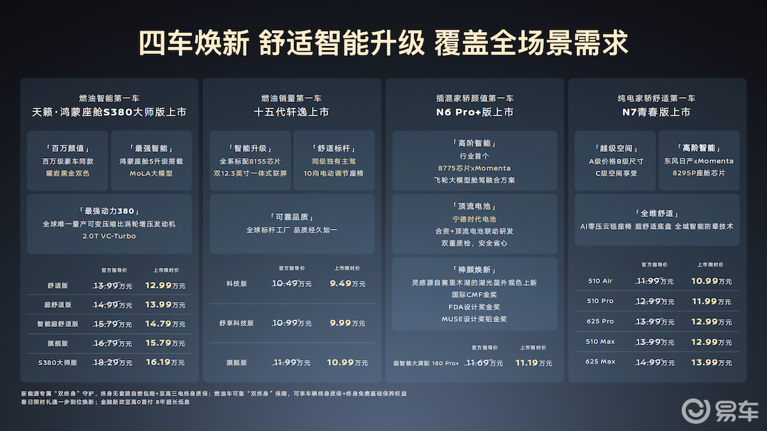 为回馈广大用户,东风日产在此次春季发布会上同步推出了极具诚意的购车权益,新能源专属“双终身”守护、燃油车可靠“双终身”保障。其中,N6/N7可享终身无套路自燃包赔及三电终身质保权益;天籁全系及十五代轩逸可享终身免费保养服务;天籁全系可享整车终身质保,轩逸全系可享动力总成终身质保。