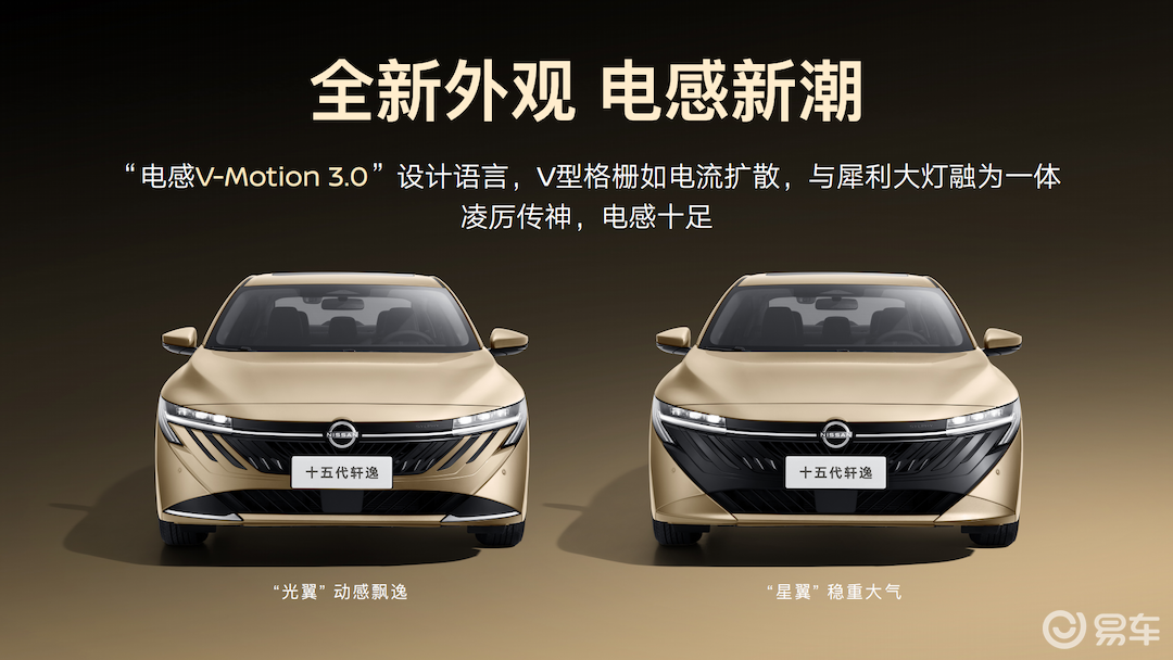设计上,十五代轩逸采用了全新的电感V-Motion 3.0设计语言,V型格栅与犀利大灯融为一体,视觉感受凌厉而传神。新车提供了“光翼”与“星翼”双前脸造型,分别满足动感飘逸与稳重大气的不同审美需求,搭配“萤石金”、“炽岩红”等五种高级车色,个性鲜明。其宽体低趴的车身姿态,配合流畅的溜背线条和极具辨识度的贯穿式尾灯,将科技感与优雅感巧妙结合。