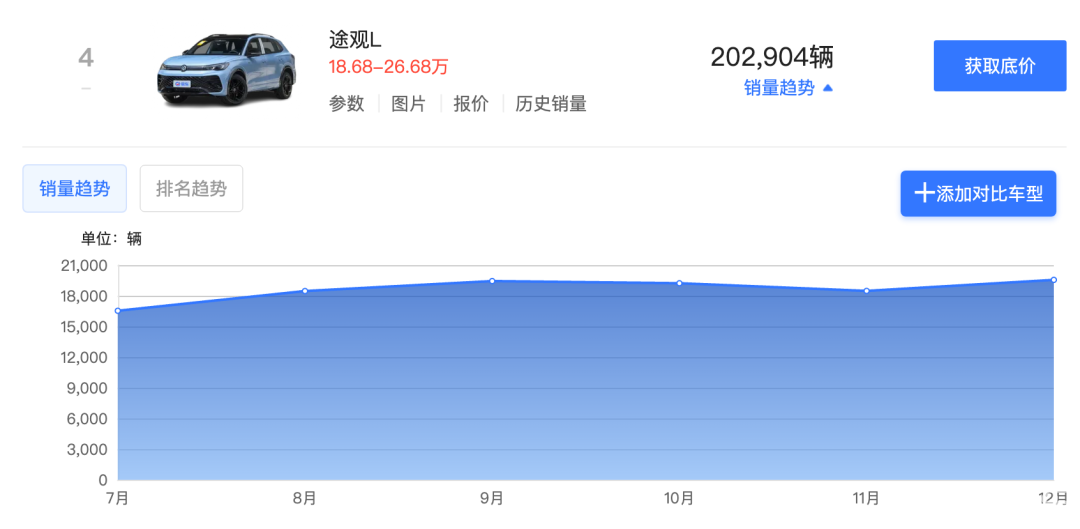 途观L于2024年5月换代,车系更名为途观L Pro,与老款帕萨特同堂销售,当时指导价格区间为23.68-26.68万元。作为上汽大众旗下中型suv,途观L在当下市场的表现还算不错。2025年,途观L全年销量202,904辆,在中型燃油车市场中排名第一,在燃油suv市场中排名第四,在合资SUV市场中仅次于RAV4荣放。