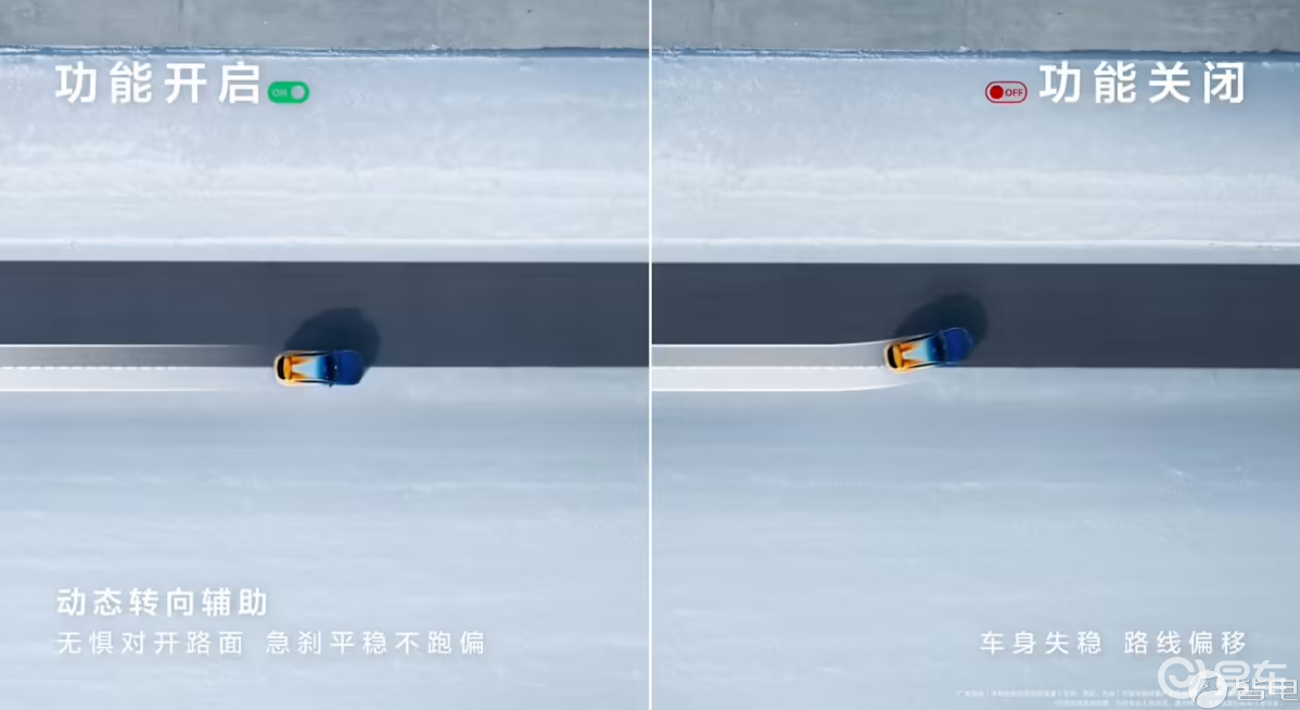 在开启「动态转向辅助」后,该车面对沥青+冰雪混合对开路面(沥青附着系数≈0.7、冰面附着系数≈0.1),可实现急刹平稳不跑偏的效果,同时还支持稳定高速连续变道。