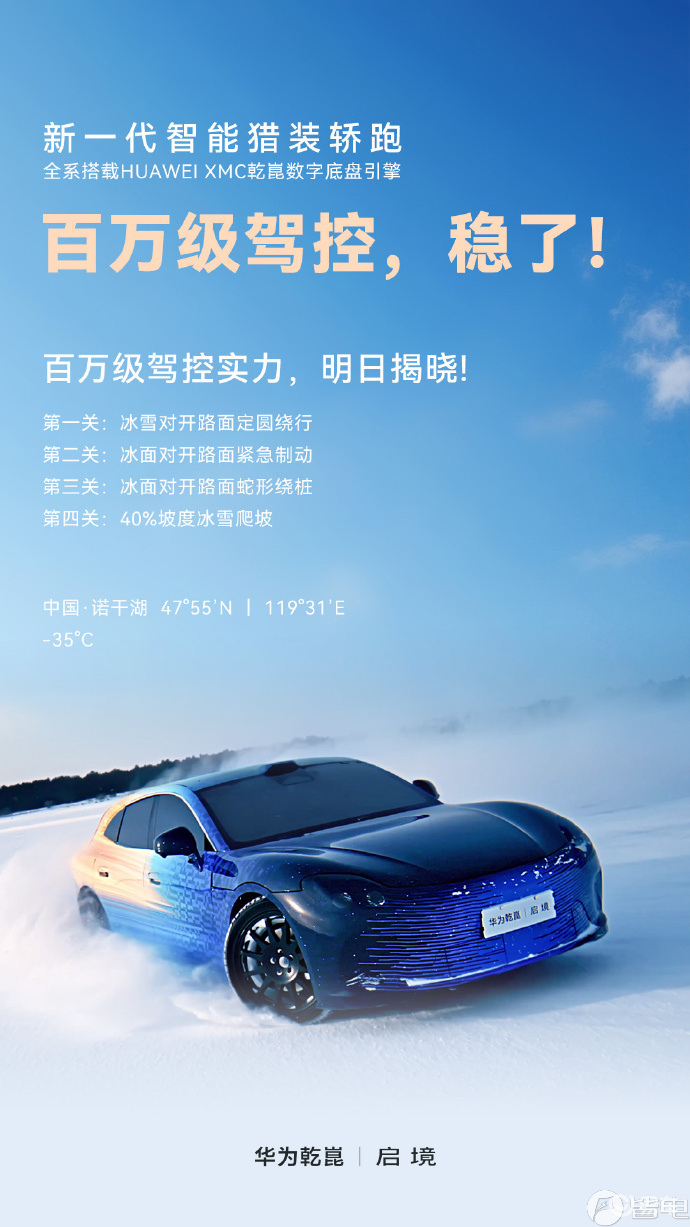 3月3日消息,华为乾崑 | 启境汽车官方发布新一代智能猎装轿跑的冬测视频。据介绍,新车全系搭载 HUAWEI XMC 乾崑数字底盘引擎,官方表示:“百万级驾控,稳了。”