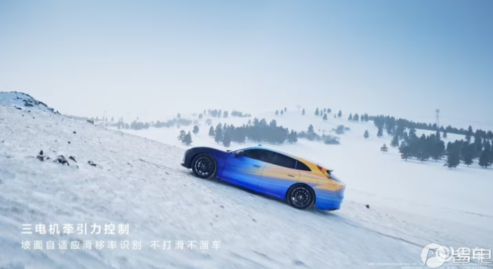 新车还挑战40%坡度的冰雪爬坡场景,通过「三电机牵引力控制」,实现坡面自适应滑移率识别,不打滑不溜车。