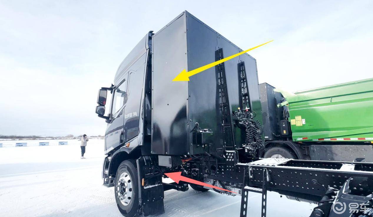 参加这次黑河低温测试的Q3超级电动卡车,驾驶舱与梯形车架之间,清晰可见热管理系统的电动空调压缩机和PTC预热模块(红色箭头所指),而动力电池总成紧贴在Q3超级电动卡车驾驶舱后端,缩减冷却管路长度,降低“冷量”和“热量”丧失导致的低效率。